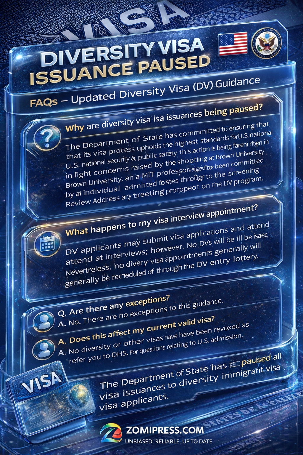 The U.S. Department of State has announced a temporary pause on issuing Diversity Visas. While Diversity Visa applications and interviews may continue, no Diversity Visas will be approved or issued during this pause.