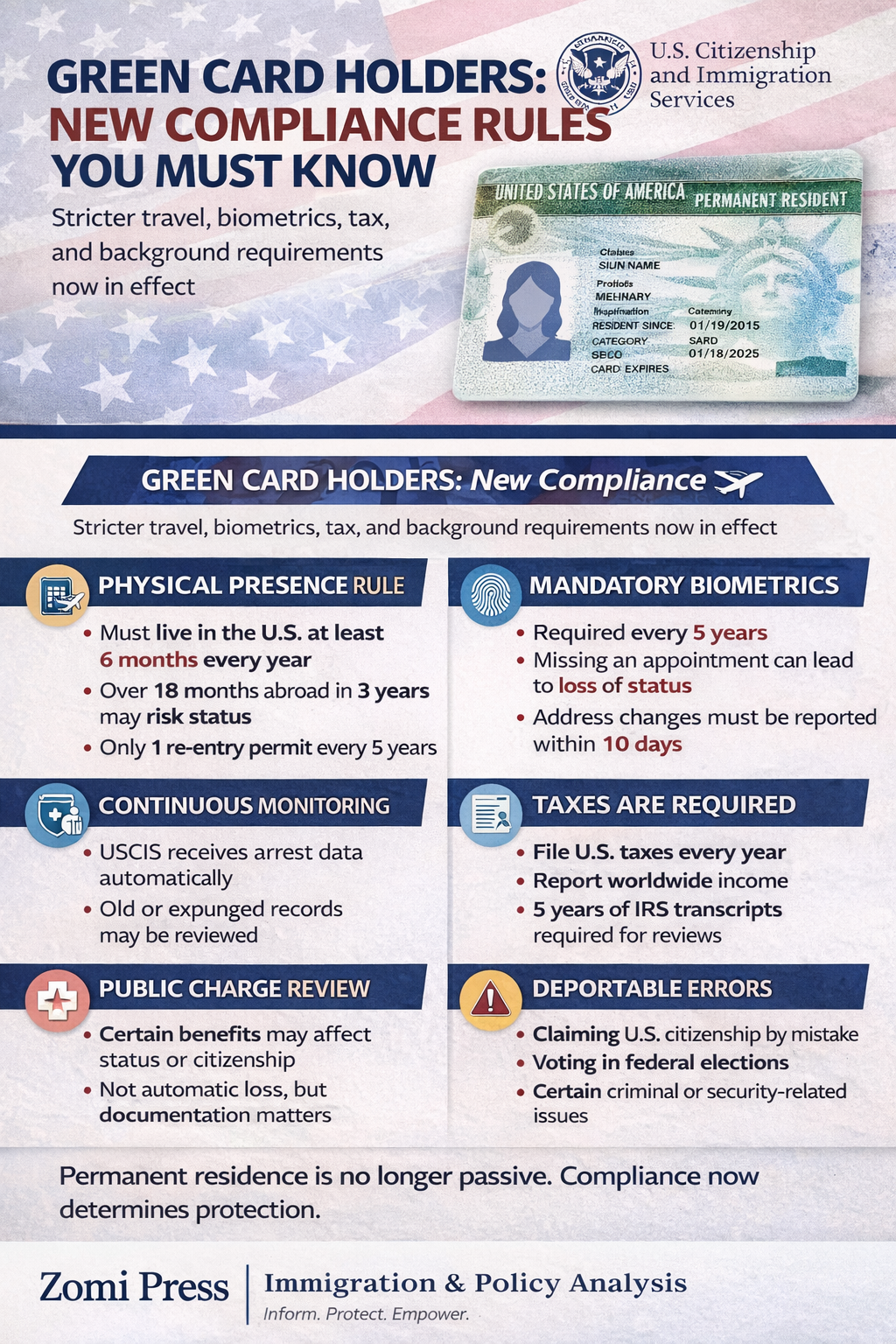 For millions of green card holders, this shift means that permanent residence is no longer passive. Compliance, documentation, and awareness now play a central role in maintaining lawful status.